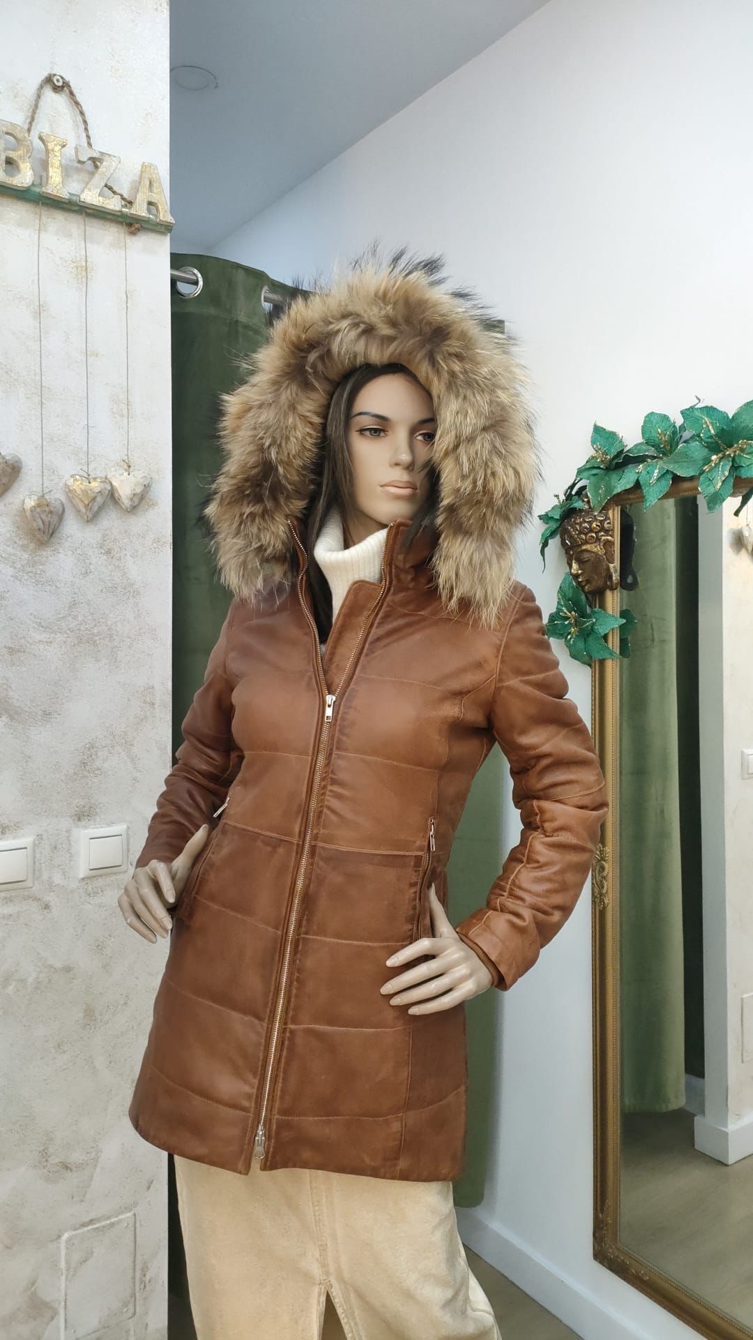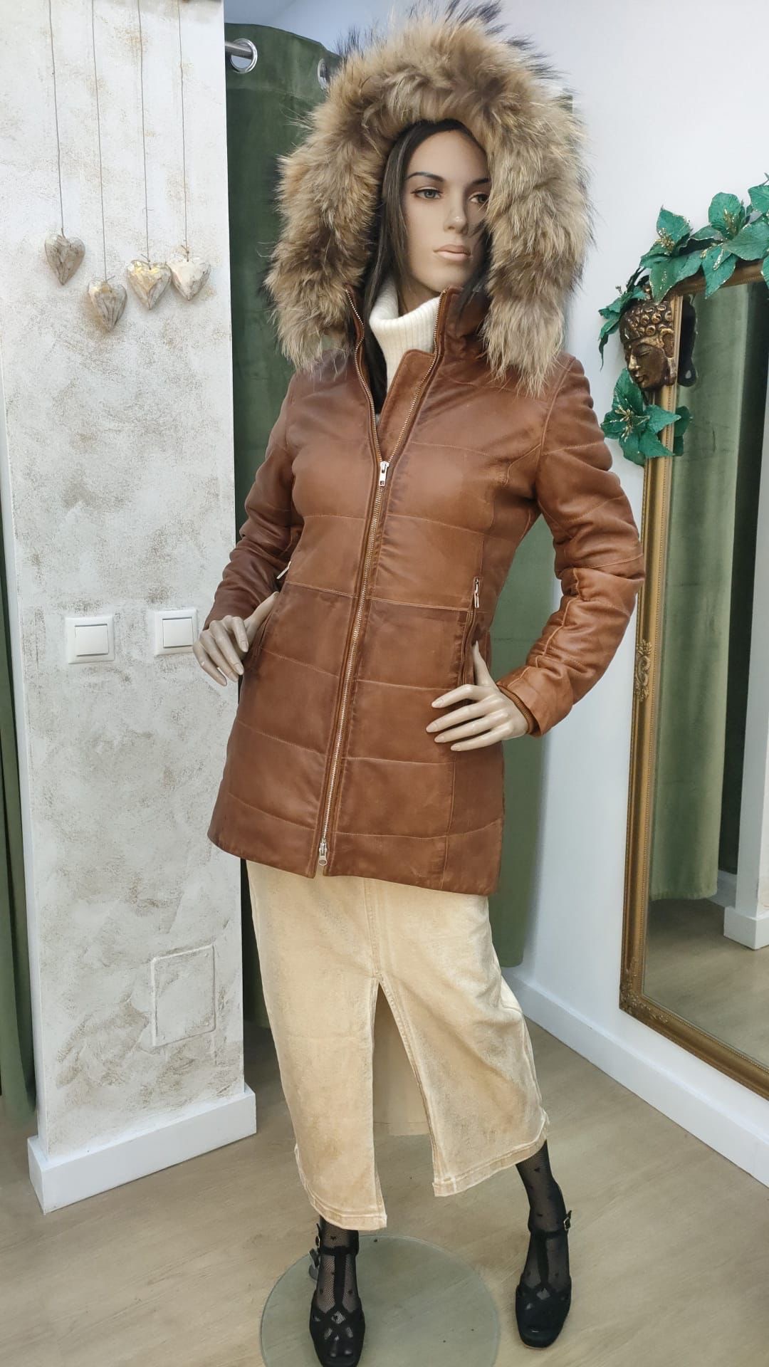 Abrigo de cuero color coñac con gorro de pelo natural