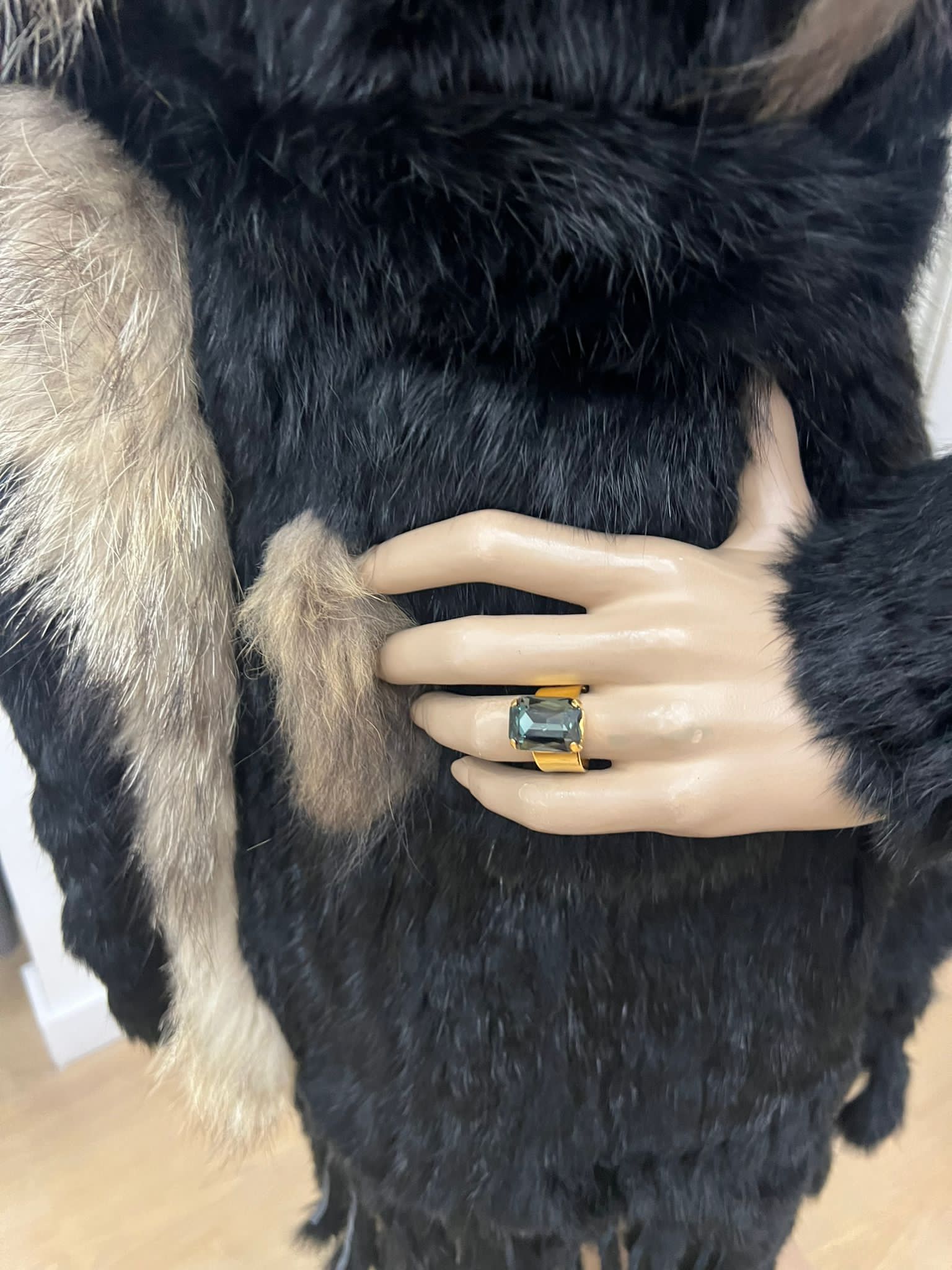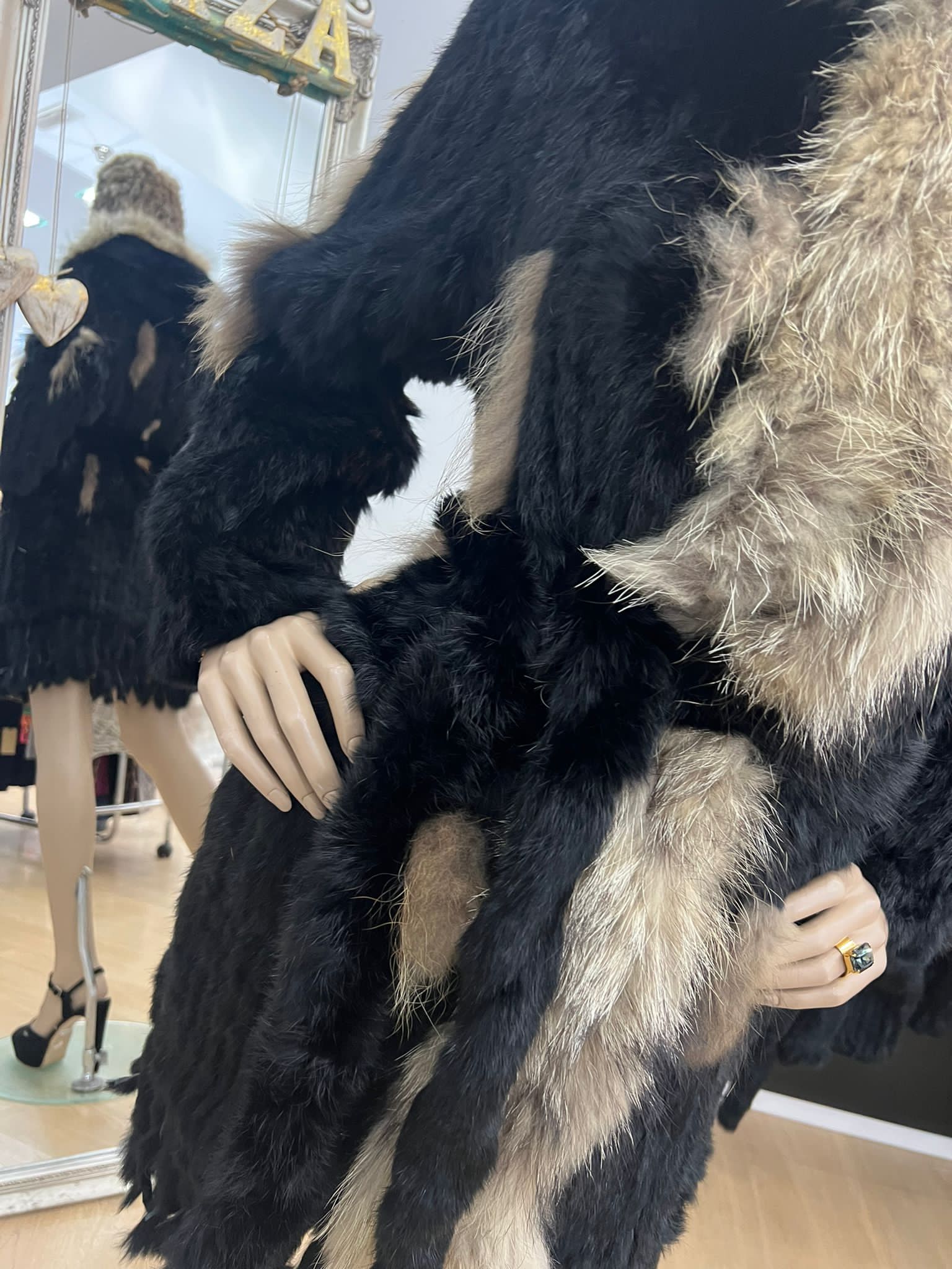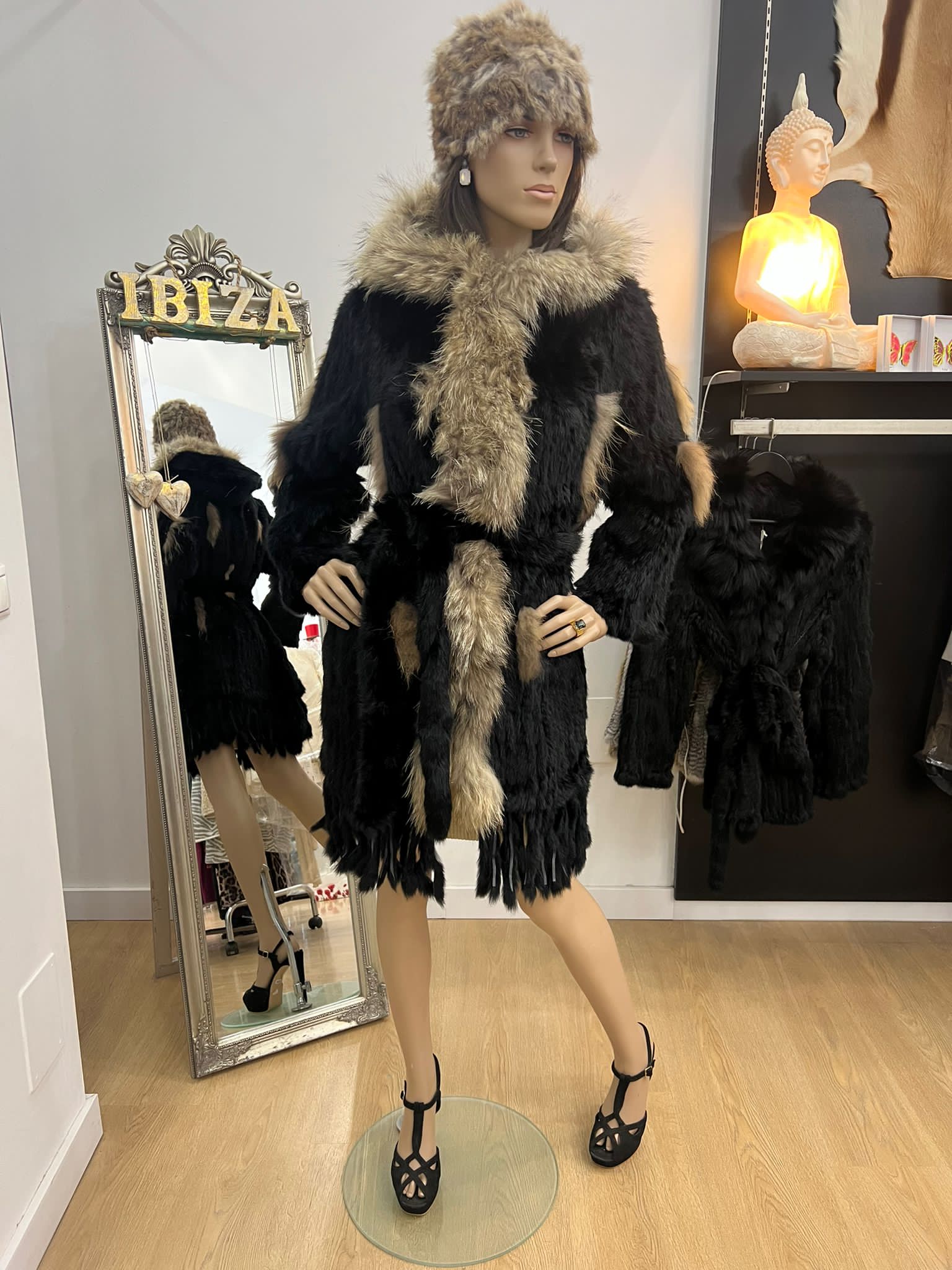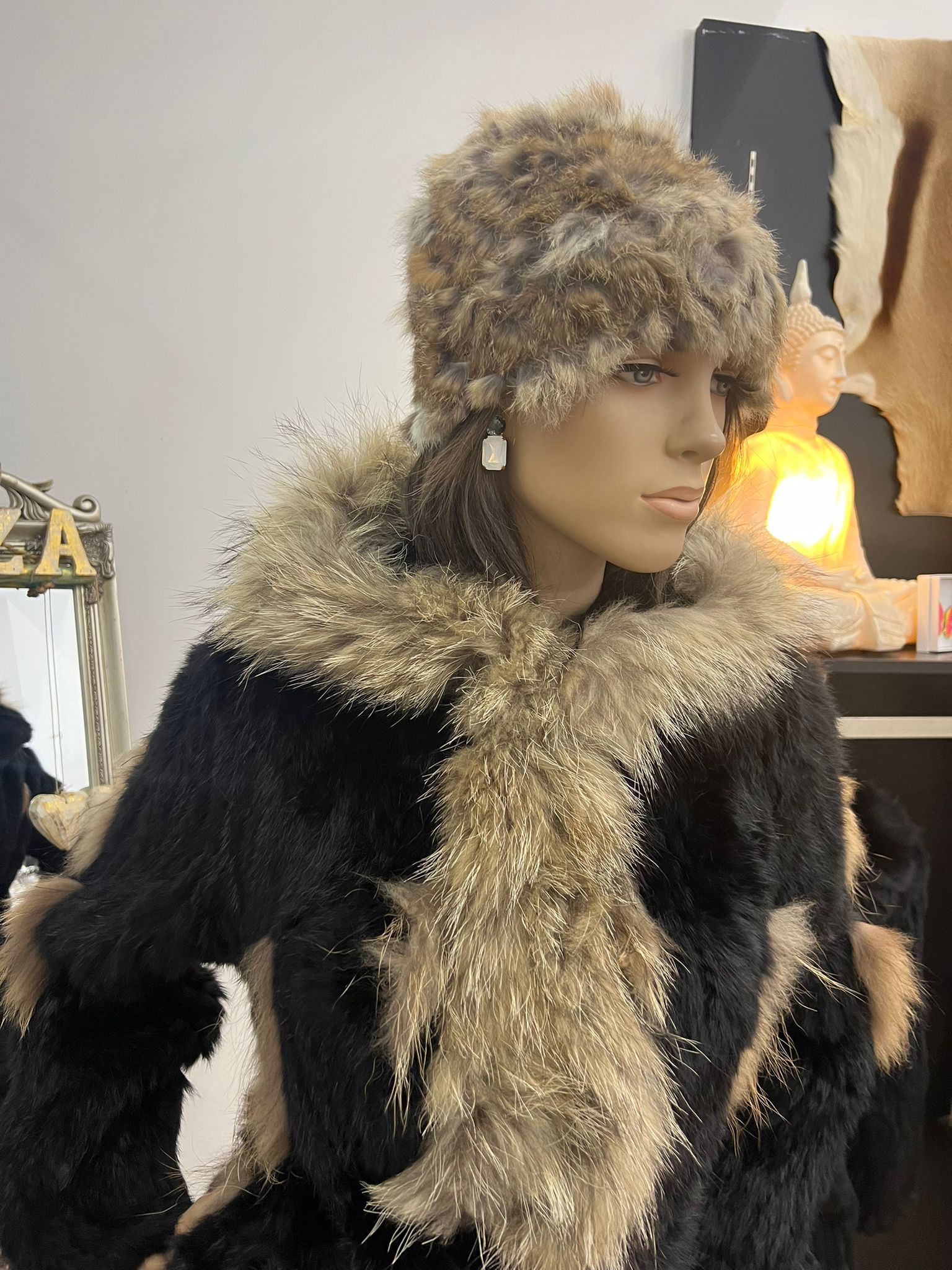 Abrigo de piel de conejo negro con gorro