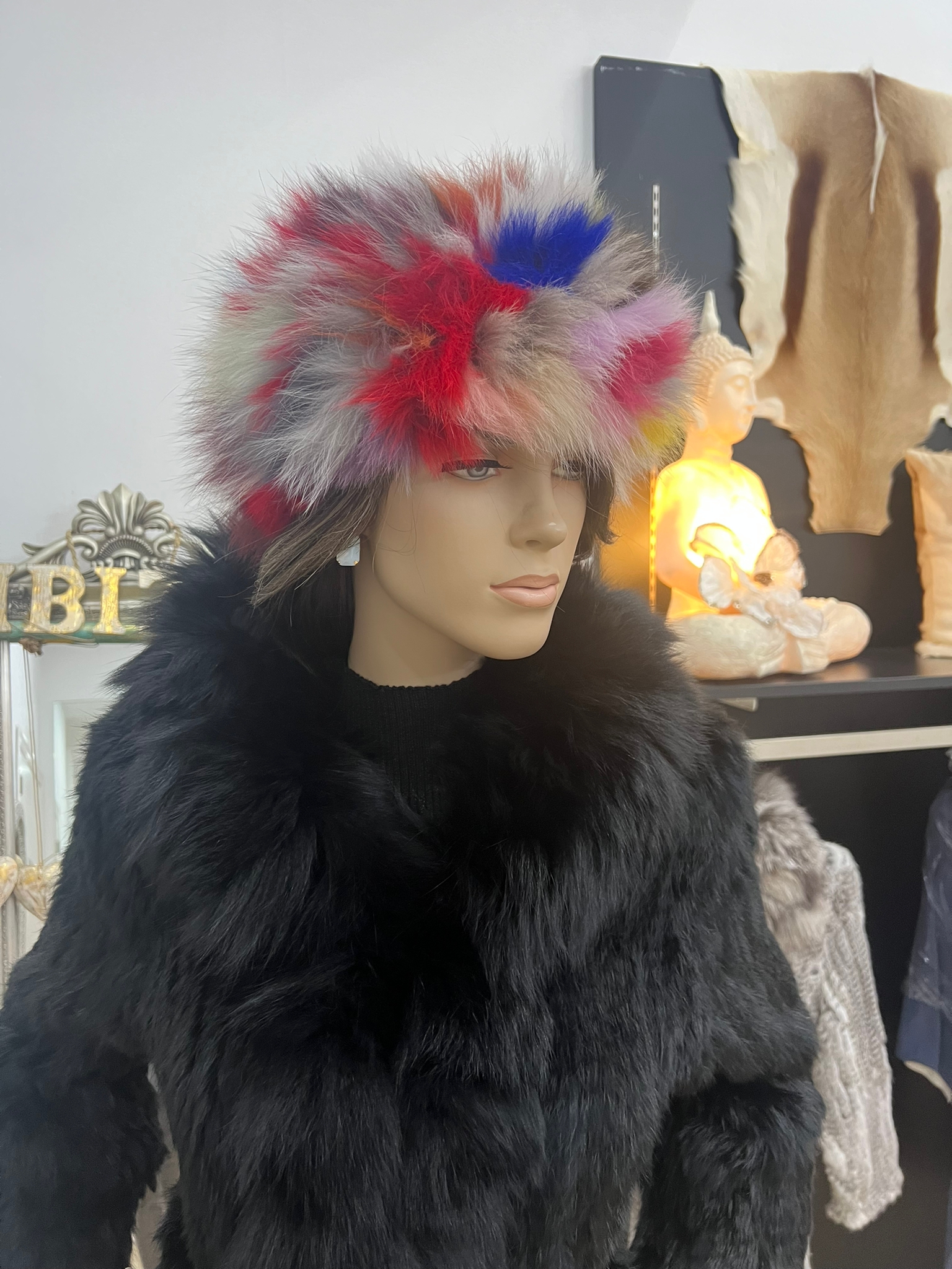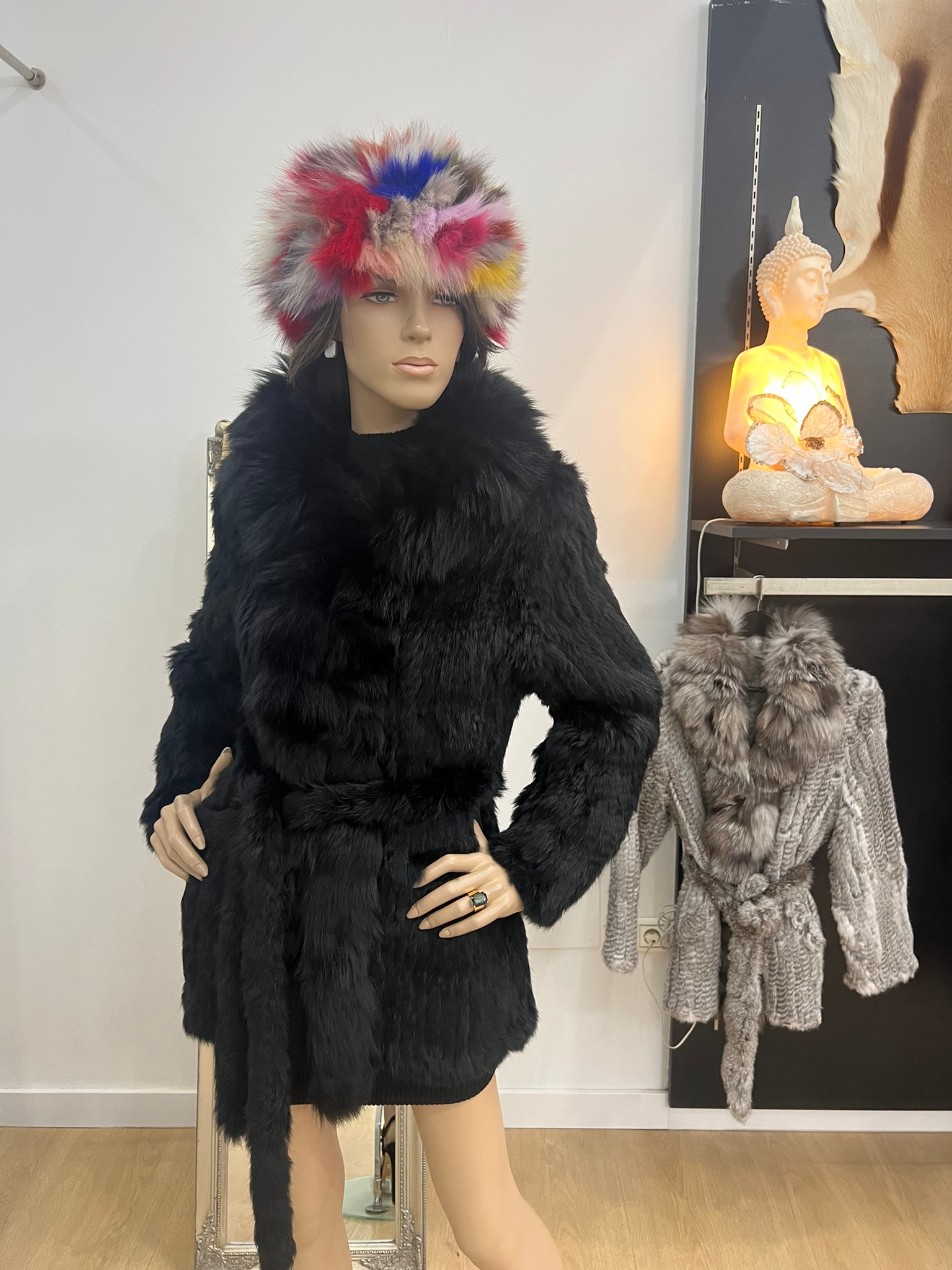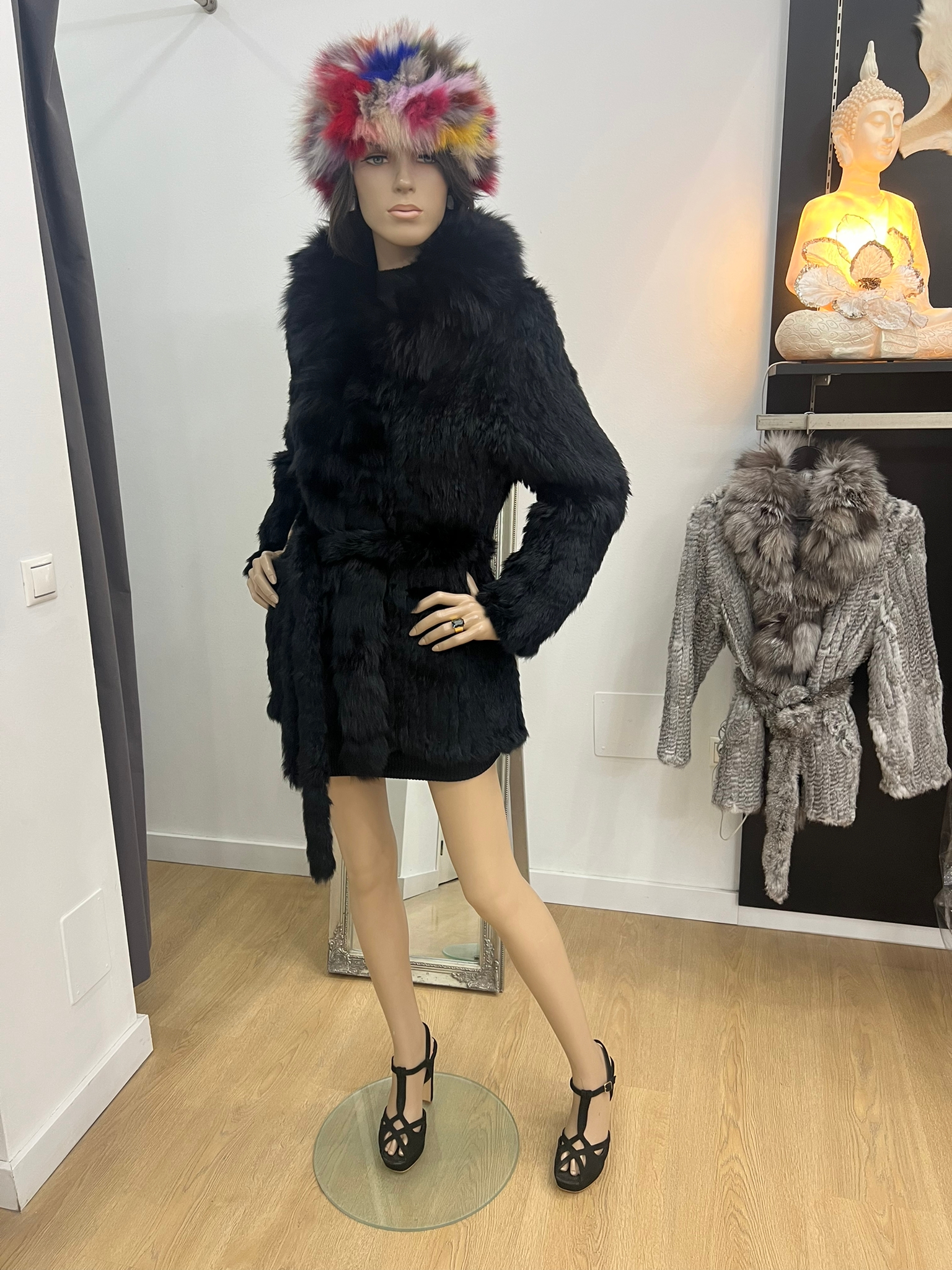 Abrigo de piel de conejo negro y cuello de zorro