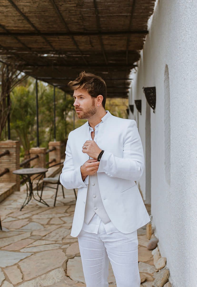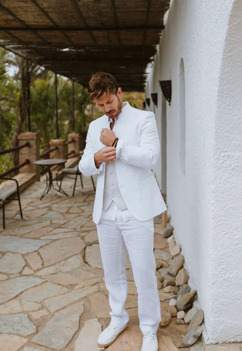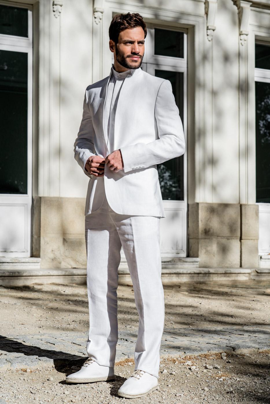 Traje de lino ibicenco cuello mao blanco